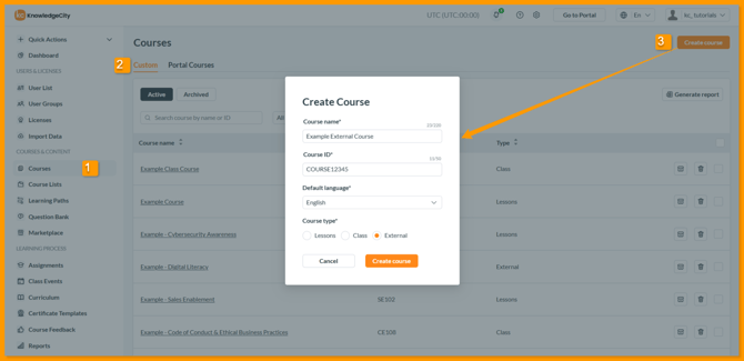 The Courses feature of the KnowledgeCity LMS allows you to track and recognize all forms of learning undertaken by your users. This guide covers the process of setting up an External course: creating a record for training completed outside the platform and configuring its details. You will learn how to access the courses section, create a new 'External' type course, and define the necessary data fields, enable Completion Data submission, add descriptions, and configure any other required details.