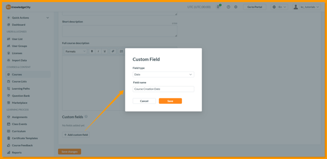 An example illustration highlighting the "Add custom field" button found in the Details tab of the course. A modal window appears allowing custom field creation.