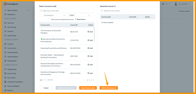 - Search & Filter: Find specific courses by name, filter by category or language, or select Show only not exported courses to only see new courses that haven't been exported before.