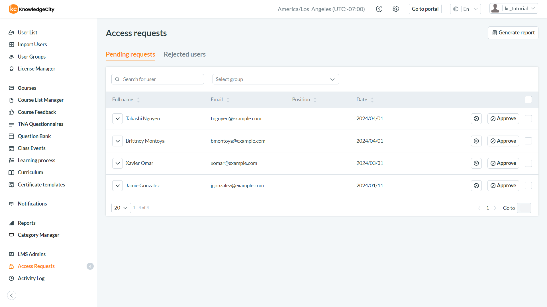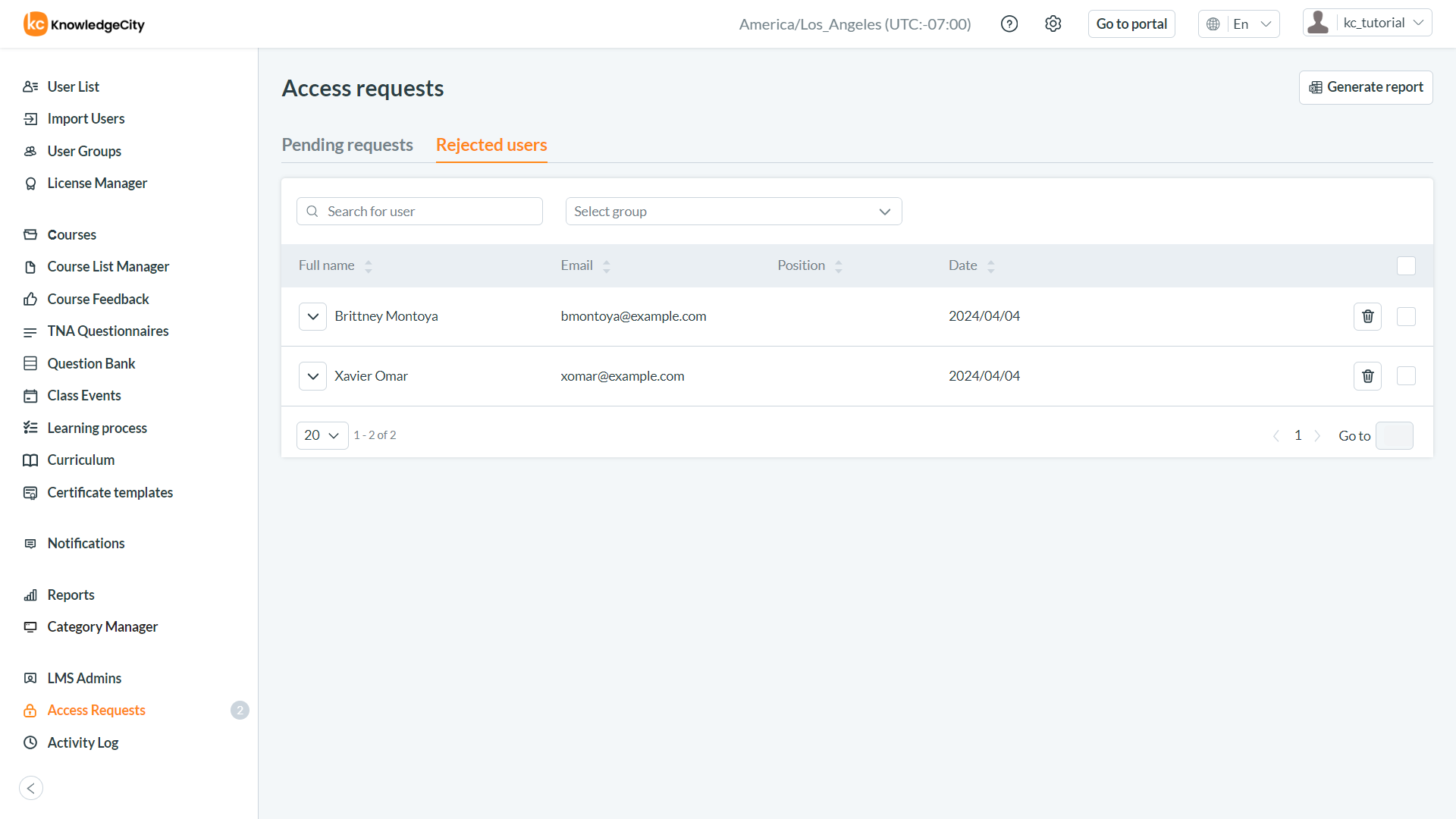 By following these steps, you can efficiently manage access requests and maintain a streamlined user management process within KnowledgeCity's LMS. These actions ensure that only authorized learners can access your course content and use your LMS resources.