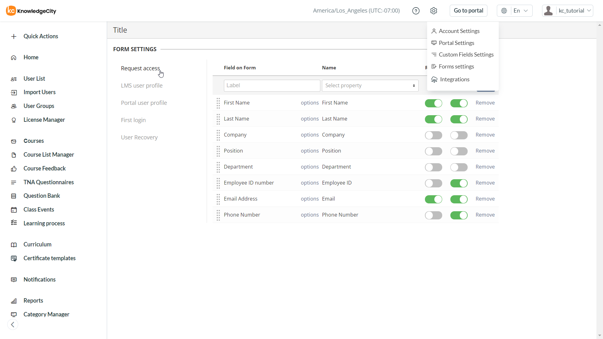 The Request Access contact form can be customized by an LMS Super Admin by clicking the gear icon in the top-right area of the LMS and selecting Form Settings: