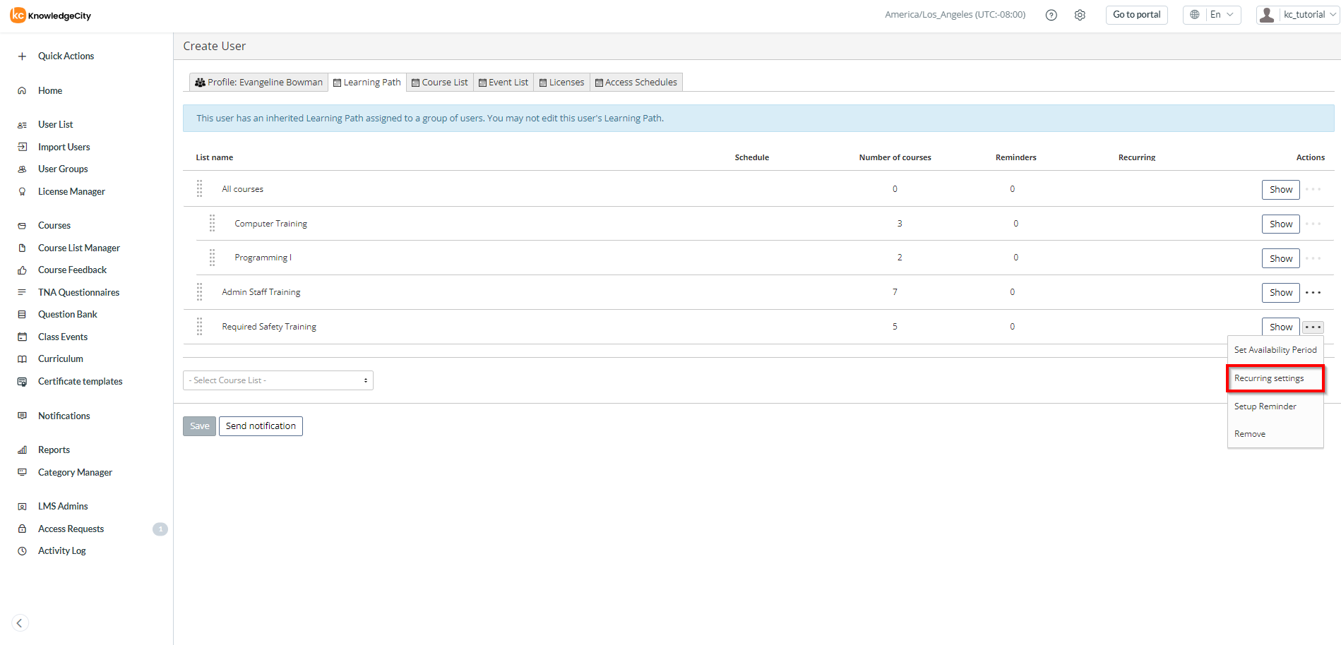 Note: The "Learning Path" tab may also be displayed as the "Assignments" tab. - Select the course list you want to set to be recurring.