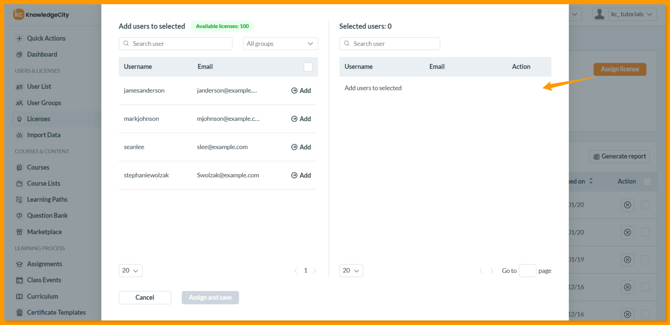 In the user selection modal, users can be searched by login name, email, or filtered by group.