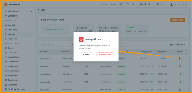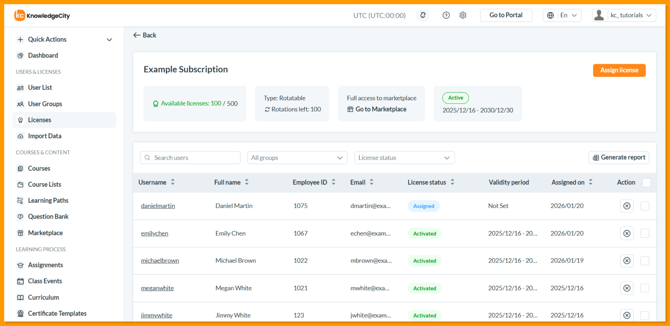 Licenses are an administrative section designed for the comprehensive management of subscriptions and licenses associated with various training courses and content available in the platform. It aids in viewing current subscriptions and licenses and includes features for assigning, un-assigning, and rotating licenses. License rotations only apply to rotatable subscriptions.