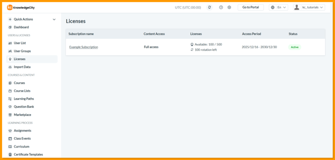 An example illustration overview of the KnowledgeCity LMS Licenses section.